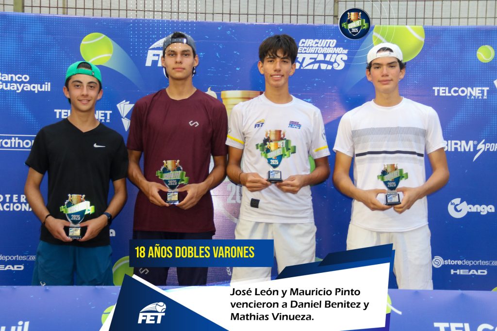 En 18 años varones, el pichinchano José León y el tungurahuense Mauricio Pinto vencieron al guayasense Daniel Benitez y el manabita Mathias Vinueza por 6-2, 7-5. Ailen Rojas (El Oro) y Emilia Zabala (Guayas) ganaron a las pichinchanas Rafaella Bernal y Gabriela Núñez por 2-6, 6-4, (12-10).