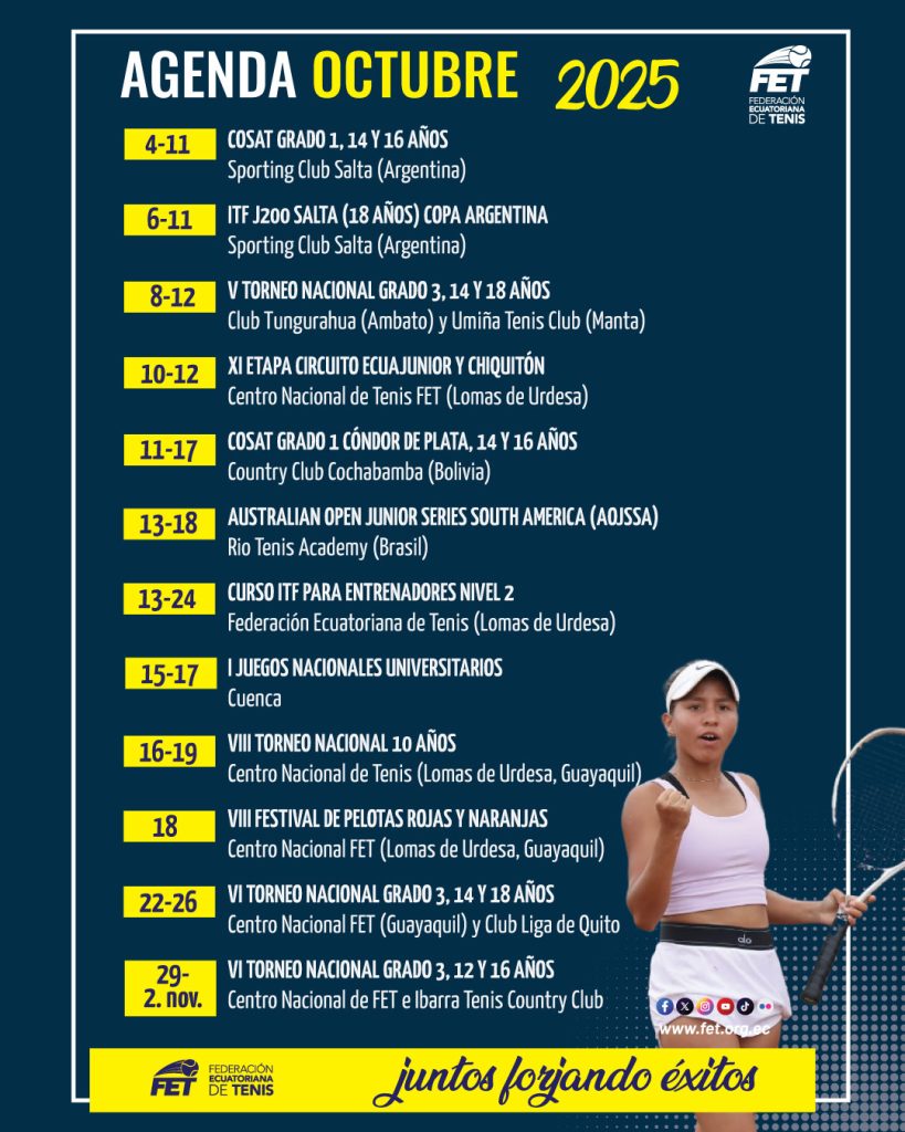 Este mes de octubre están programados 14 torneos, entre nacionales e internacionales, y una capacitación, dentro del calendario de actividades de la Federación Ecuatoriana de Tenis (FET).