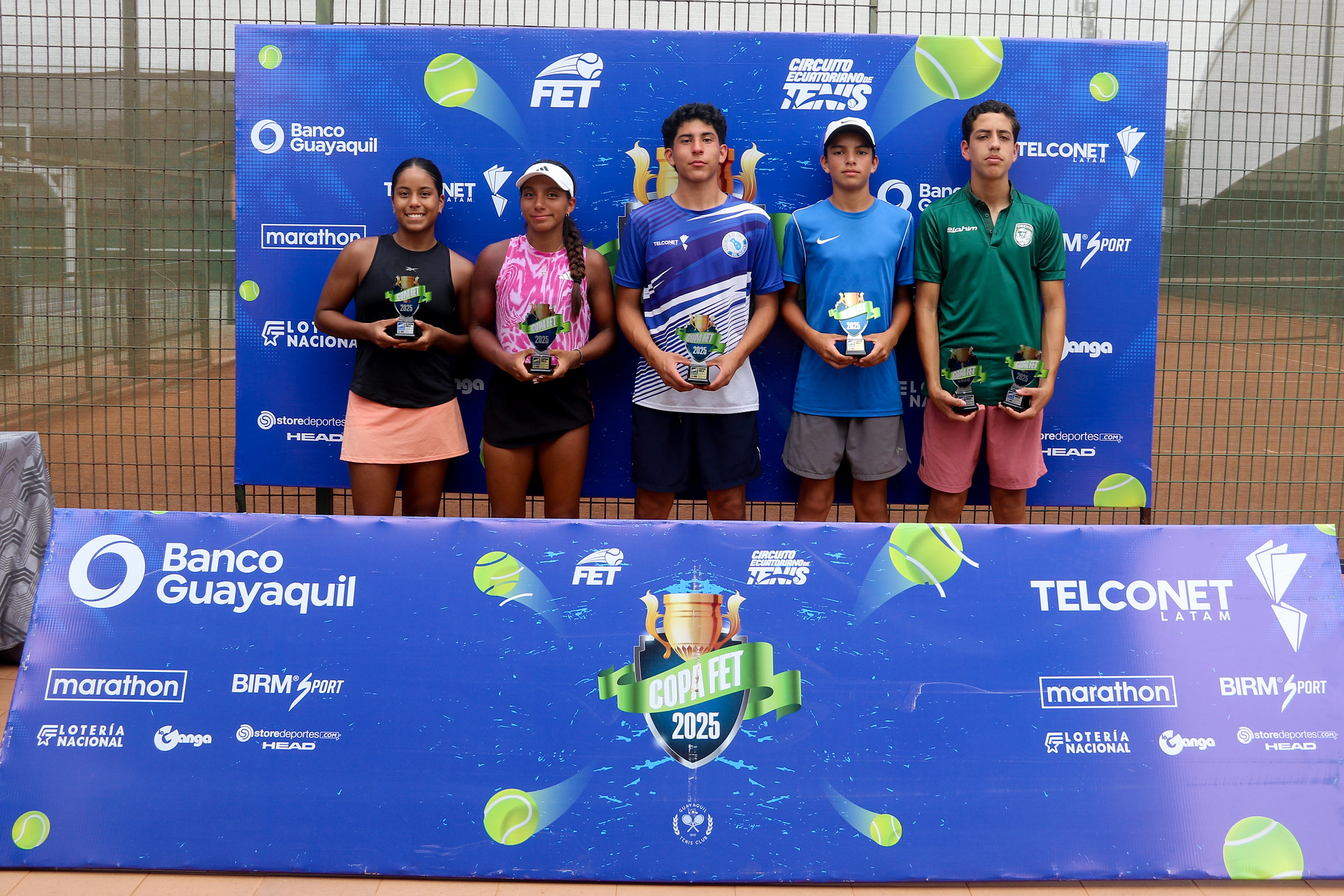 Samuel Camacho (Pichincha), Eduardo Gutiérrez (Guayas), Mauricio Pinto (Tungurahua), Mía Arias (Pichincha), Suliban Dávalos (Chimborazo) y Ailen Rojas (El Oro), cerraron su temporada 2025 a nivel local con el Campeonato Nacional Absoluto Copa FET, que se jugó del 8 al 12 de noviembre en el Anexo del Guayaquil Tenis Club (Samborondón).